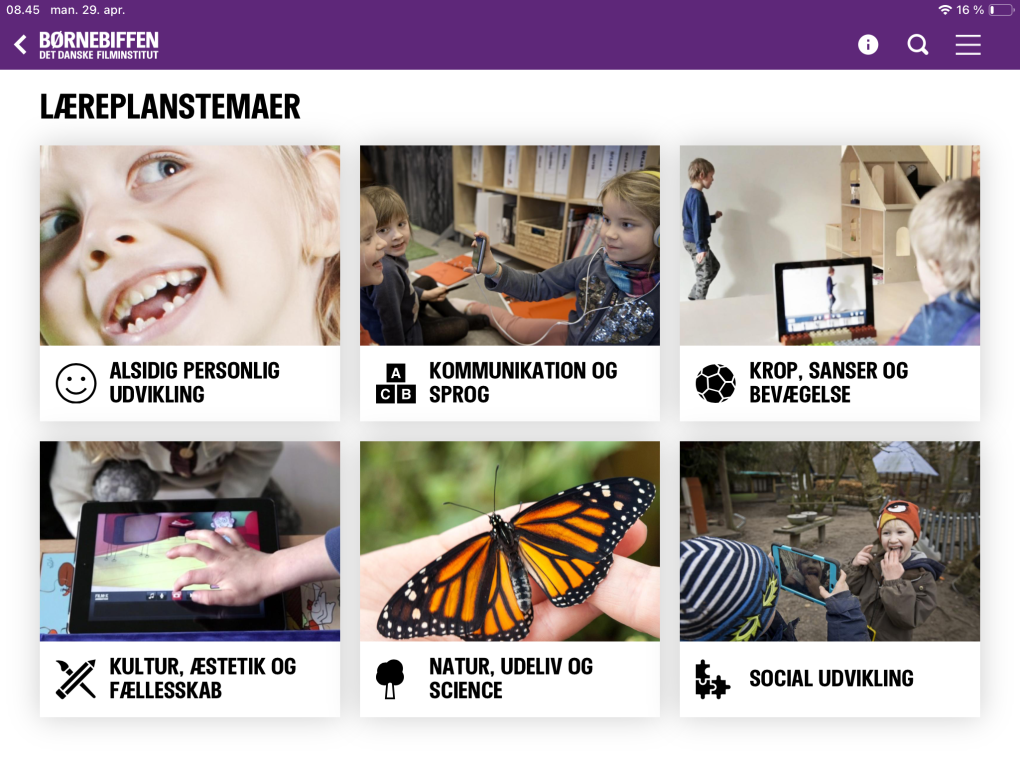 Film stimulates children’s understanding of diverse topics, language, visual storytelling and digital skills – even at a very young age. The activities in the Preschool App and Website (Børnebiffen i Dagtilbud) relate to the learning curriculum, the national educational plans, which in Denmark consists of six themes: Personal Development; Social Development; Communication and Language; Body, Senses and Movement; Nature, Outdoor and Science; Culture, Aesthetics and Community.