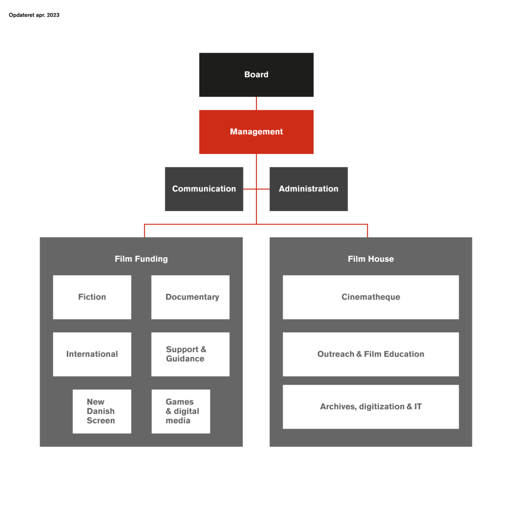 The Danish Film Institute’s organisation is divided into two areas, Film Funding and Film House, each comprising a number of departments.