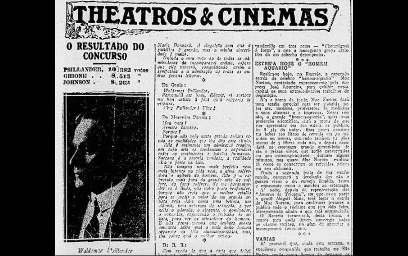 The announcement of Psilander's victory in the star popularity contest, in which he triumphed over Emilio Ghione and Arthur Johnson by a margin of over 2,000 votes. Correio da Manhã, 1 November 1915.