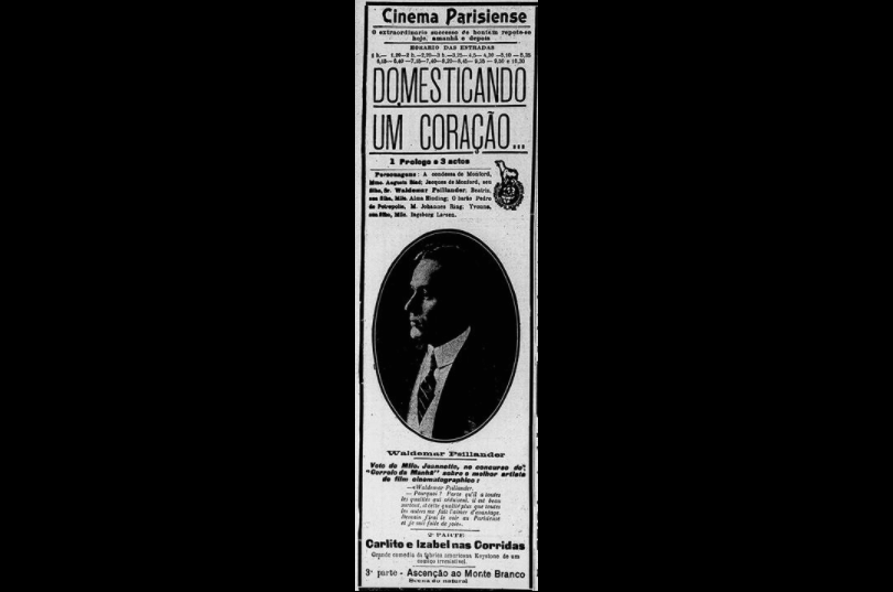 While an imperfect measure of public perceptions, the aforementioned 1915 star popularity contest sponsored by the Correio da Manhã gives some sense of Psilander’s public appeal and his position within the panorama of the local film market. The newspaper published a large number of film-related advertisements, which were presumably a valued source of revenue; thus, it likely had economic incentives for offering publicity and opportunities for cross-promotion to local exhibitors. After Francesca Bertini triumphed narrowly over Asta Nielsen in the earlier contest dedicated to female stars, the Odeon (part of the CCB’s exhibition circuit) organized a special gala screening for female fans, with free tickets distributed from the offices of the newspaper.21 During the second contest, the Cinema Parisiense apparently took advantage of the publicity by screening Kærlighedens Triumf(Domesticando um coração/The Romance of a Will, Holger-Madsen, Nordisk, 1915), going so far as to incorporate into its advertisements a letter written by one of Psilander’s fans, which had previously been printed in the Correio da Manhã.22 Like several of the missives published by the newspaper during the contest, this letter was written in French, and was penned by a female fan who was likely well-educated and affluent. In the Cinema Parisiense’s publicity, the letter was marshaled as proof that the venue’s offerings were attracting a refined clientele, in turn helping the venue draw in well-heeled spectators.