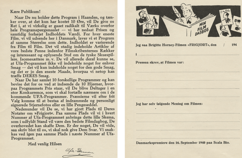 Propagandaoffensiven overfor det læsende biografpublikum sætter først for alvor ind med etableringen af Ufa København den 15. august. Blandt andet med en udvidelse af Ufa-Programmet, der hidtil havde været en uregelmæssig ad hoc-udgivelse, som fulgte tyske films premierer i Danmark. Programmet bliver fra august 1940 nærmest et lille tidsskrift med omtaler af aktuelle film, petitstof, portrætter af og anekdoter om tyske skuespillere og faste klummer om filmproduktion. En lille fjendtlig finurlighed, som måske kan have fået folkene bag FILM og andre filmskribenter til at træde varsomt overfor tysk film, er en fast udklipsblanket, som indgår i hele første årgang. Her opfordres publikum til at holde deres egen filmoplevelse op imod, hvad pressen skrev.
